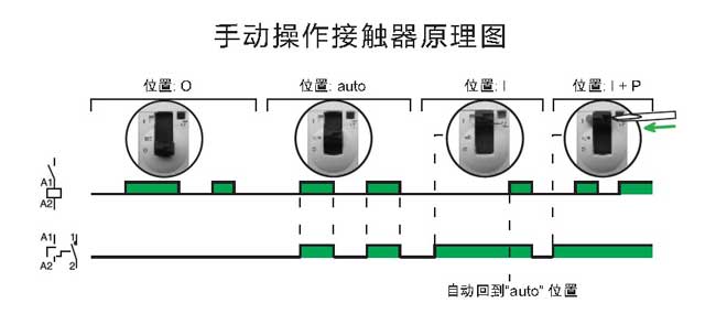·手動操控的接觸器在其前端面有4個位置選擇開關:自動操作模式;臨時“開”;永久“開”: 用于鎖定安裝維護過程中處于“開”位置的接觸器;關斷狀態(tài)